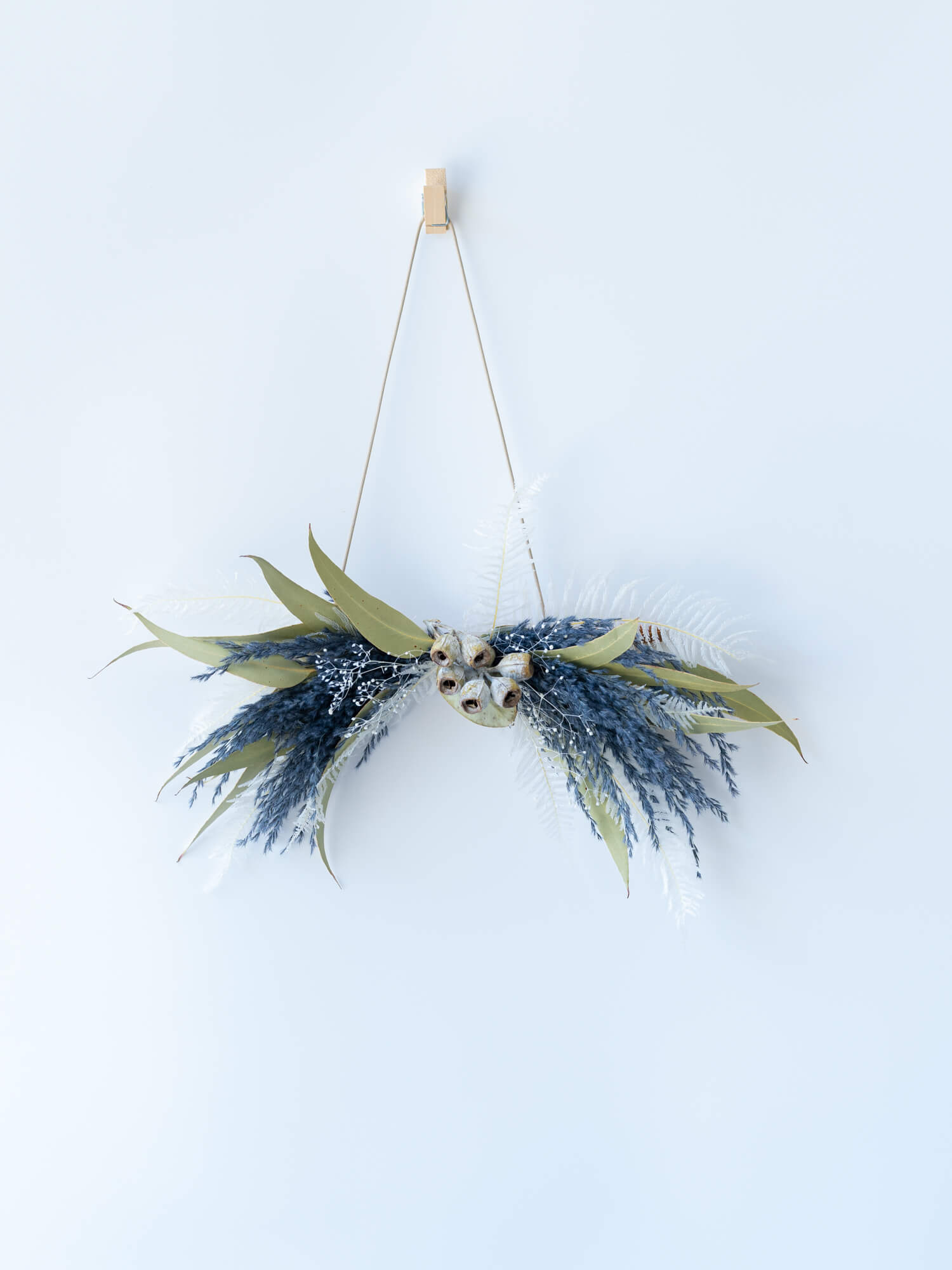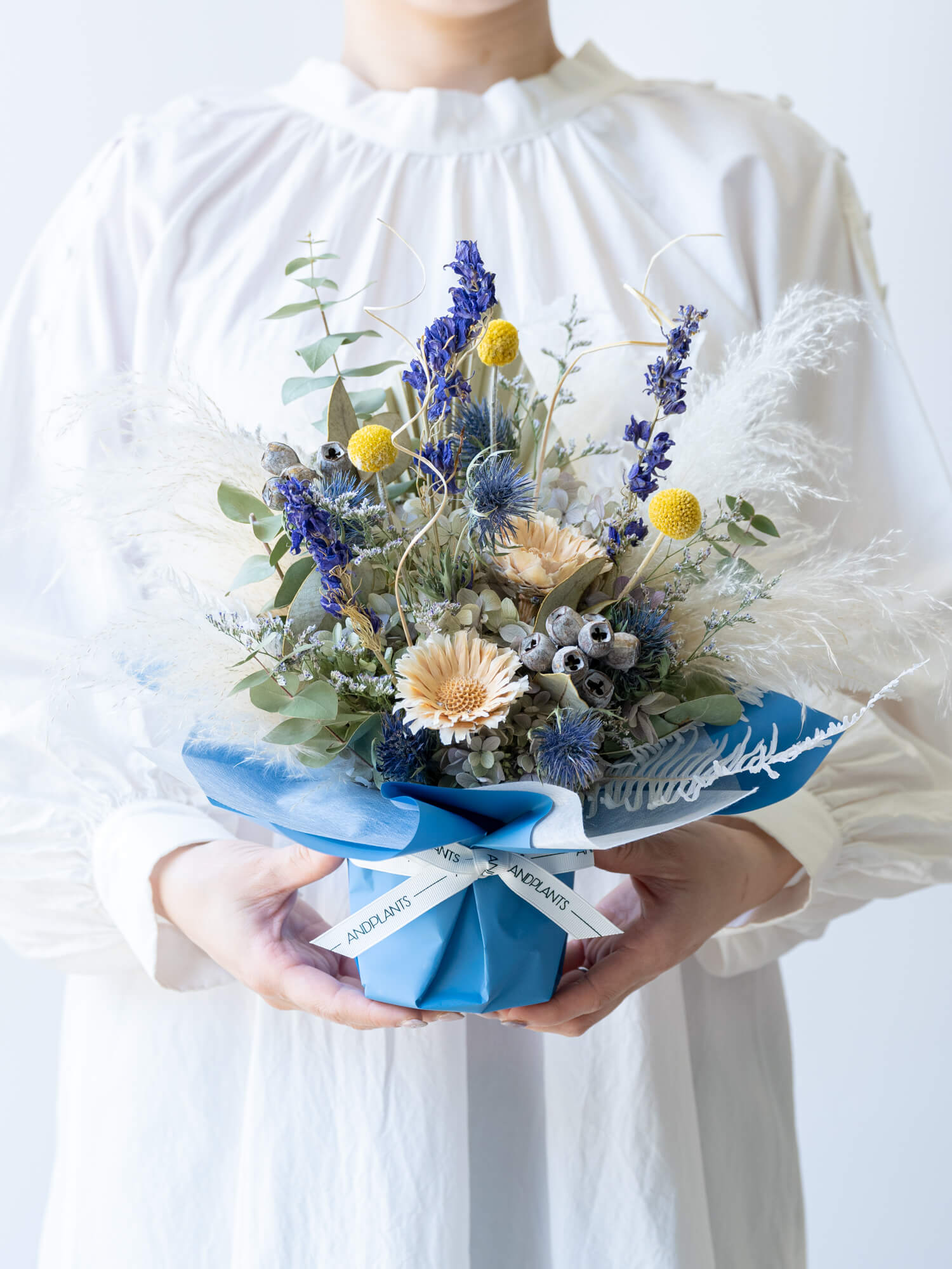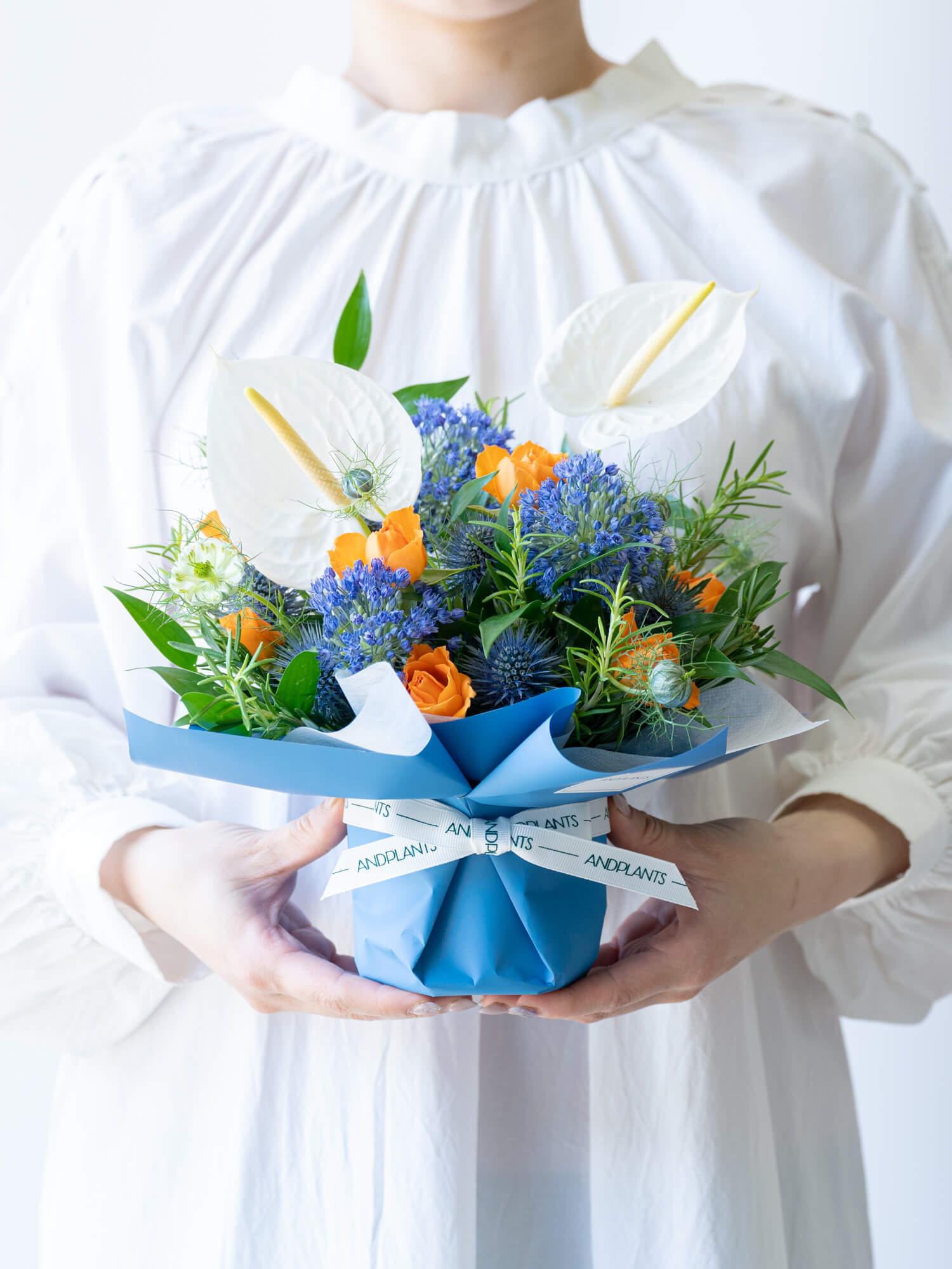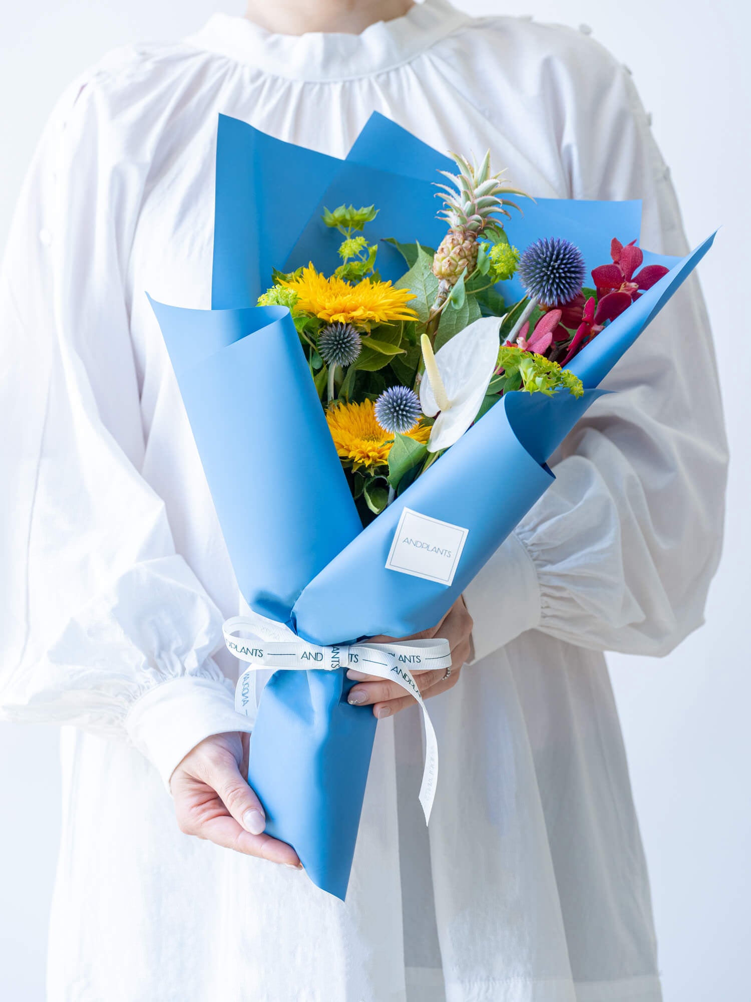 鮮やかなブルーやユニークな花々を組み合わせたブーケ。