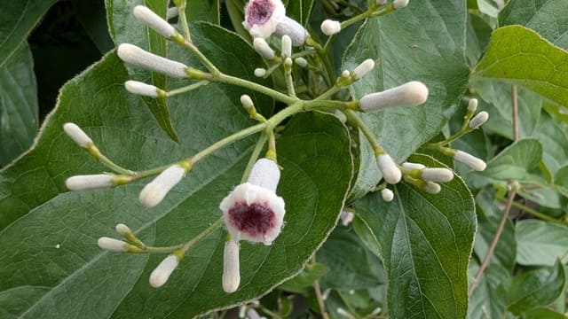 この小さなつる性植物は、美しい白い花と紫色の斑点という、自然が作り出した芸術作品のような美しさを持っています。名前から受ける印象とは全く違う、繊細で可憐な魅力に満ちた植物でした。