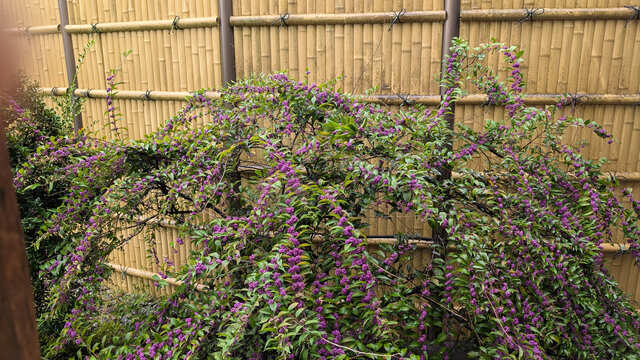 初夏には小さな薄紫の花を咲かせ、秋には宝石のような紫色の実が枝にびっしりとつきます。