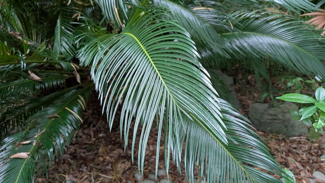 ソテツの最も印象的な特徴は、羽状に広がる美しい葉です。一般的には以下のような特徴を持ちます:
