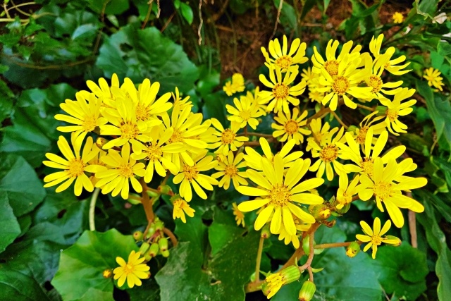 ツワブキの最大の魅力は、なんといっても秋の深まりとともに咲く鮮やかな黄色い花です。10月から12月にかけて、長い花茎を伸ばして菊のような黄色い花を次々と咲かせます。